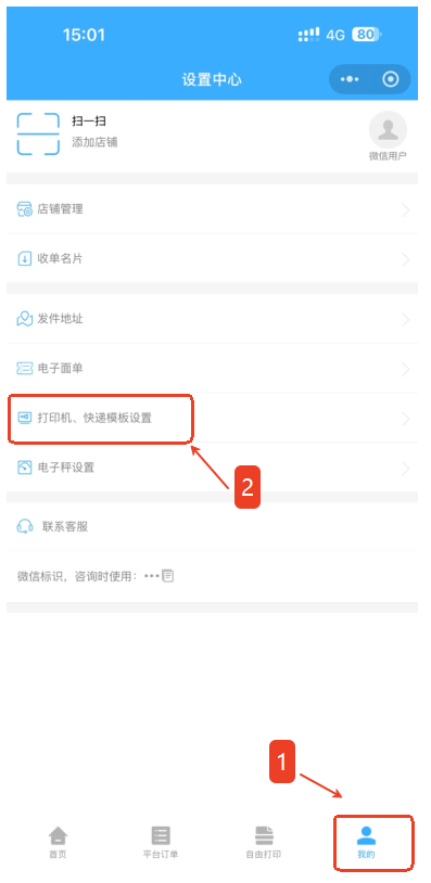 2、打开店管家微信小程序(店打单),点击“我的”>“扫一扫”绑定店铺;