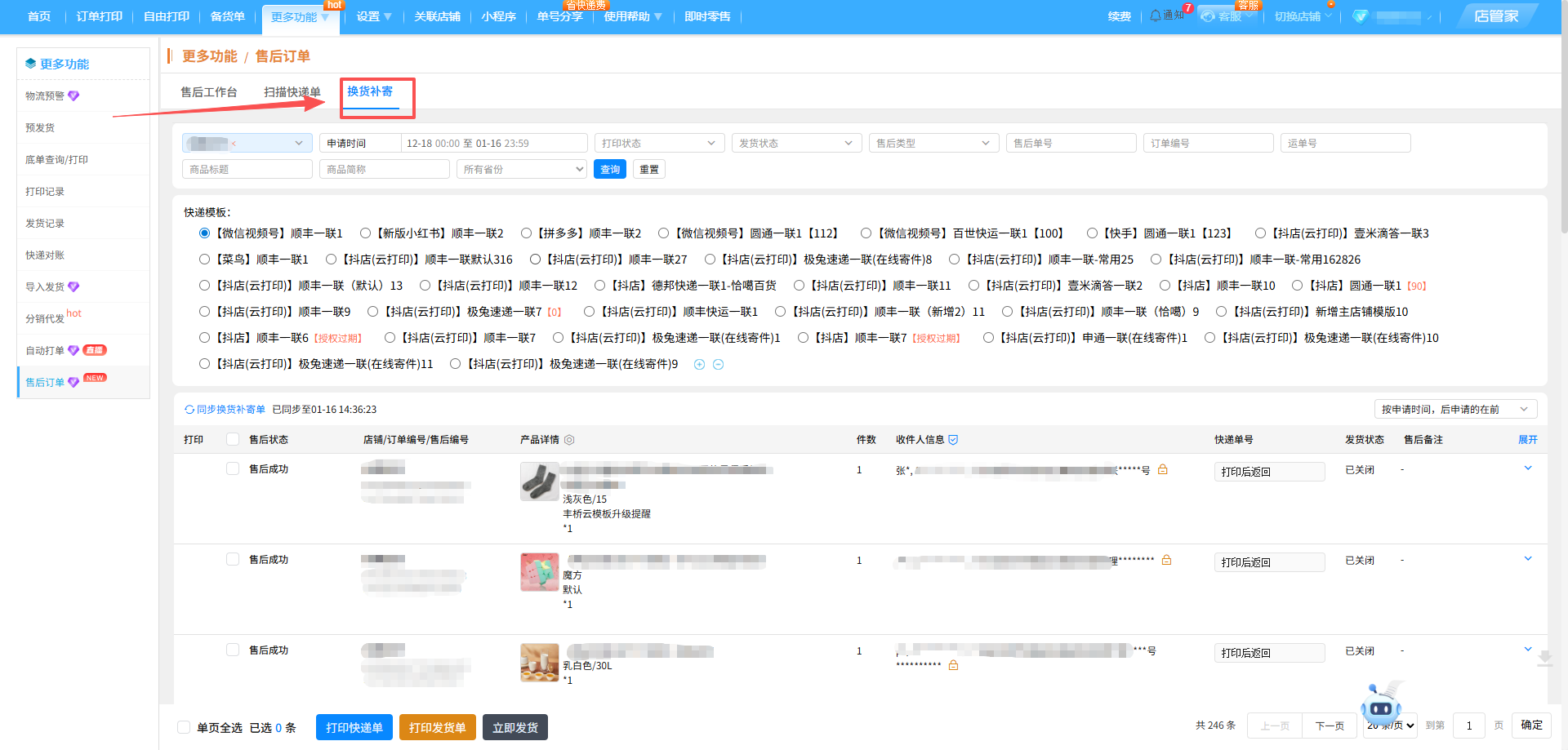 -在店管家,在您同意买家换货、补寄申请后,我们自动同步换货补寄订单信息!与常规订单相同的打印发货流程,让您处理流程更省心!